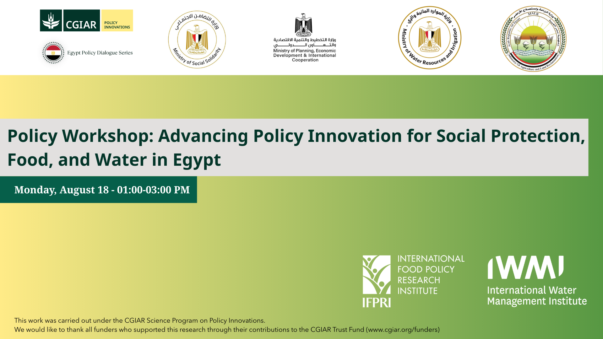 The workshop aimed at examining the interest of the policymakers on tools and research questions related to social protection, food and water policies in Egypt, and to check on alignment on the government NWFE program. This workshop also launched CGIAR's Policy Innovation Science Program which is a continuation of the National Policies and Strategies Initiative (NPS) work in Egypt.