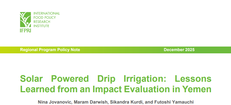 This policy note summarizes findings from a clustered randomized controlled trial (RCT) conducted in eastern Yemen to assess the impacts of subsidized solar powered drip irrigation systems on smallholder farmers’ production decisions and household food security. The study provides causal evidence on how subsidizing solar drip irrigation for smallholders affects crop choice, market engagement, and welfare outcomes in a fragile, water-scarce context. The intervention led to a significant shift in cropping patterns, with treated farmers becoming less likely to cultivate cereals and more likely to grow higher-value horticultural crops. Treated households also sold a greater share of their harvest in markets during the first season following installation, suggesting increased commercialization. However, the study did not detect significant short-term impacts on household food security, indicating that production changes did not immediately translate into improved consumption outcomes.